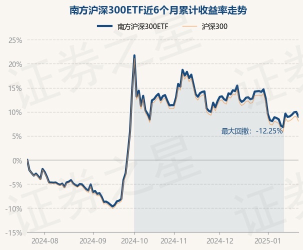 本站消息,1月22日,南方沪深300ETF最新单位净值为3.8199元,累计净值为1.719元,较前一交易日下跌0.91%。历史数据显示该基金近1个月下跌3.22%,近3个月下跌3.81%,近6个月上涨8.99%,近1年上涨21.31%。该基金近6个月的累计收益率走势如下图: